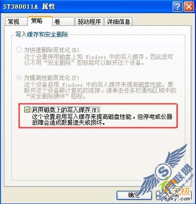 在“我的电脑”上单击鼠标右键选择“属性->硬件”,打开设备管理器找到当前正在使用的硬盘,单击鼠标右键选择属性。在硬盘属性的的“策略”页中,打开“启用磁盘上的写入缓存”(如图1)。