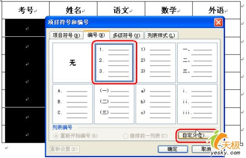 1、在一个成绩表的“考号”这列中准备填入考号6101、6102、6103……6144、6145,其中61代表班级,后边两位是学生顺序号。这时我们可以选中“考号”这列下边所有的单元格,单击“格式”→“项目符号和编号”, 在“项目符号和编号”对话框中选择“编号”选项卡,随便选择一种编号方式,然后点“自定义”按钮。(如图1)