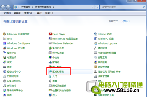 2.在打开的控制面板中选择“区域和语言”,如下图红色方框所示
