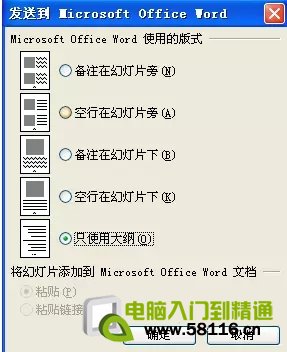 四 PPT转Word 打开要转换的PPT幻灯片,单击“文件→发送→Microsoft Word”菜单命令。然后选择“只使用大纲”单选按钮,并单击“确定”按钮,等一会就发现整篇PPT文档在一个Word文档里被打开。在转换后会发现Word有很多空行。在Word里用替换功能全部删除空行可按“Ctrl+H”打开“替换”对话框,在“查找内容”里输入“^p^p”,在“替换为”里输入“^p”,多单击几次“全部替换”按钮即可。(“^”可在英文状态下用“Shift+6”键来输入)。