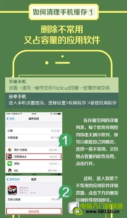 针对五的话,iphone在管理存储空间界面是可以直接删除的,android手机型号较多,可能会出现不同情况,建议安装一个清理工具来额外卸载清理,例如:360手机卫士,百度手机卫士,猎豹清理,这些软件正确的用法是:如果你不喜欢,帮你清理完你就卸载掉。