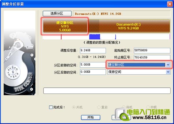 DiskGenius是一款硬盘分区及数据恢复软件。 有时候,我们需要把一个分区拆分成多个分区。使用DiskGenius的无损分区大小调整功能,对调整后的剩余空间,选择'建立新分区'选项,就能轻而易举的实现这个功能,如下图所示:
