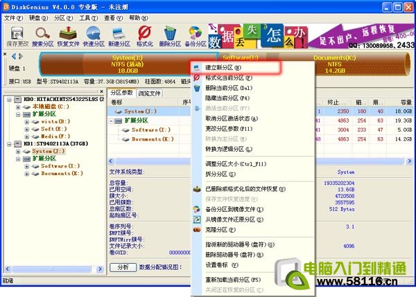 更进一步,DiskGenius提供了方便的“拆分分区”功能。选中要拆分的分区,点击鼠标右键,在弹出菜单中,选择“建立新分区”菜单项,如下图: