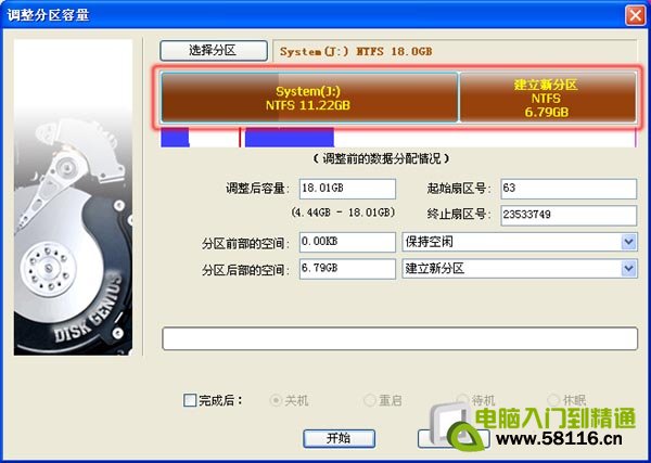 用户可以根据自己的需要,修改调整分区对话框的参数,所有操作均与无损分区大小调整相同。