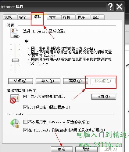 打开网页经常弹出一个提示框框:每次一个cookie基于您的隐私策略被限制时,隐私图标显示在状态栏上。怎么把它关掉呢? 出现这个提示一般是浏览器的安全隐身设置的太高,才会出现