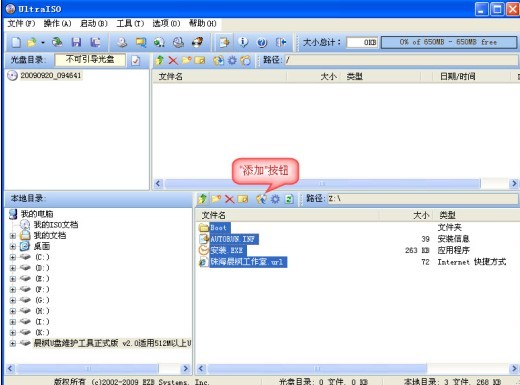 4, 如图2所示,在“本地目录”中选择Z盘即解压后的所有文件,然后点击“添加”按钮。