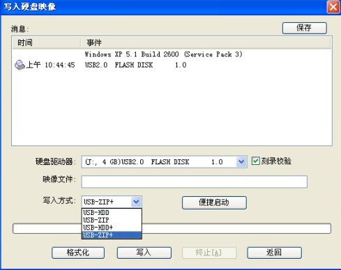 5, 插入U盘后,在UltraISO中选择“启动→写入硬盘映像”,在“硬盘驱动器”中应该能看到你的U盘(如图3)。UltraISO提供了四种写入方法, 其中“USB-ZIP+”比“USB-ZIP”的兼容性还好,且绝大多数提供USB启动的主板都提供“USB-ZIP”模式,因此在“写入方式”中要优先 选择“USB-ZIP+”。