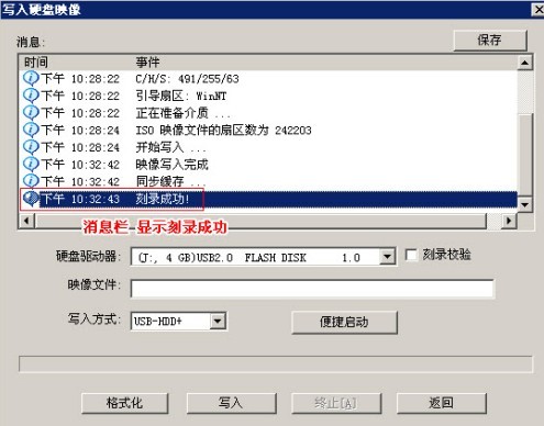 6, 点击“写入”,当显示“刻录成功”后(如图4),你的启动盘就制作完成了。