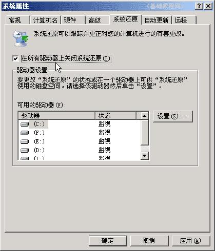 ![]() 3)点击选中上面的“在所有驱动器上关闭系统还原”,然后点下面的“应用”按钮;