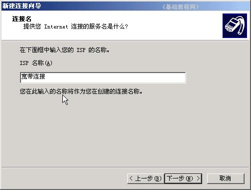![]() 6)接下来的连接名称里,输入一个名称,例如 “宽带连接” ,这儿只是一个名称;