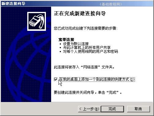 ![]() 8)在接下来的完成面板中,勾选上“在我的桌面添加一个快捷方式”,点完成按纽结束;