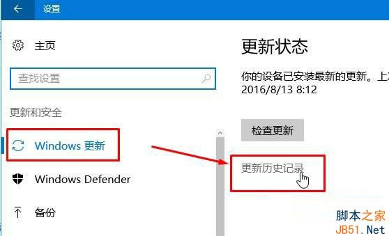 2、在“windwos 更新”选项中点击“更新历史记录”;