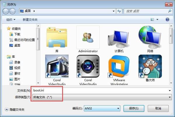 2、在文本文档中输入以下代码,将该文件另存为“boot.ini”格式;