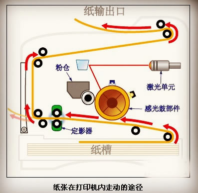 通过上面这张图,我们可以看到一张纸,从被右下角的搓纸轮搓起之后,在打印机内部要走过的途径。当然对于不同的激光打印机,这个线路是有所不同的,但是过程不会错,大家都一样,有的产品,不是使用激光,使用的led进行打印。