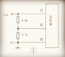 该显示器为二灯高压板,电源为直流12v,元件为贴片式,损坏后可用市售二灯高压板直接进行代换,原板插座的⑤、⑥脚为+12v,③、④脚接地(板上有编号标注),把⑤、⑥脚对应的插头线剪断接到代换板的+12v的红线上,③、④脚对应插头线剪断接到代换板接地端的黑线上,用1/4w的一个4.7kq电阻和一个6.8k欧电阻串联,串联后6.8k欧电阻接+12v,4.7k欧电阻接地,代换板开关控制线(一般为黄色线)连接两电阻中间接点(见图1);目的是给代换板提供5v控制电压,背光灯插头和代换板插座是不匹配的,可以采用焊接连接,用电工胶布多包几层即可,最好能套上一节绝缘套管,笔者用单芯铜线连接,代换插座采用焊接方式,另一头剥开相应长度绝缘皮并上一层薄锡后直接插进背光灯插头孔内,免去用电工胶布包扎,上锡是防止铜芯线日后容易产生氧化造成接触不良。