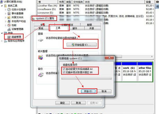 逻辑损坏(软件及系统原因):右键计算机--管理--磁盘管理--选择卷符(如c盘)右键属性--工具--开始检查,都勾选上,这样对每个盘符进行修复: