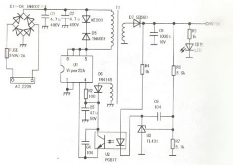 【故障检修】打开电源外壳,发现使用的是viper22a为核心的开关电源,原理见下图,viper22a ①、②脚接内部mos管源极,⑤-⑧脚接内部mos管漏极,最大输出功率达到20w,而待机功率小于1w。目测主电源滤波电容c1和c2已经鼓包,用万用表检查发现fuse保险丝已经断路,又检查u1 viper22a的⑤~⑧脚对地阻值大于0欧,依经验来看应该没有击穿,至于保险熔断的原因应该与c1和c2鼓包相关。将c1和c2拆下,换上一只22μf/400v的电解电容,因体积较大只能采取卧式安装,又更换好2a保险丝,通电测输出电压为5.25v,插上考勤机后,考勤机正常工作,故障排除。