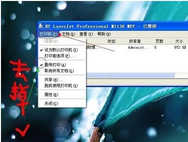 4、点“打印机”,看到“暂停”有个勾,再点击勾就好了;
