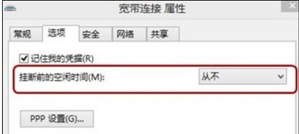 第四步,在“宽带连接”属性设置界面,选择第二项“选项”,将“挂断前的空闲时间”改为“从不”,保存退出即可。