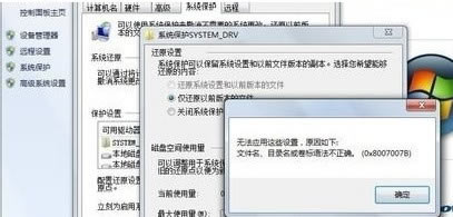 win7系统打开系统保护时提示"文件目录名或卷标语法不正确(0*8007007b)且"还原系统设置和以前版本的文件"为灰色,c盘为英文命名,如图: