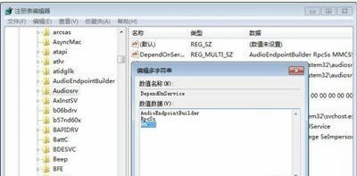 解决办法是取消win7视频播放的优先级,方法是进入注册表编辑器,依次展开到hkey_local_machine\system\currentcontrolset\services\audiosrv下,双击右侧窗口的“dependonservice”名称,然后删除对话框中的“mmcss”数值(如下图)。