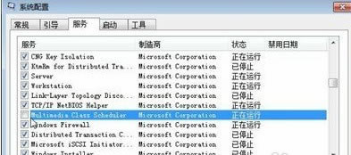 切换到“服务”标签下,找到并取消“multi media class scheduler”服务项目(如下图)。