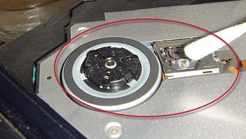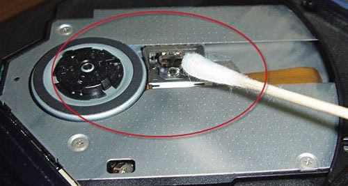 如果按照第一步操作无效,那么还需要下重手,用点无水酒精擦拭一下激光头透镜,然后再用纯净水(不要用自来水)清洁,最后擦干。期间注意不要让液体滴到电路板上。有人说酒精会腐蚀透镜或者镀膜,可咱操作这么多次,还真没发现有溶解的先例。如图: