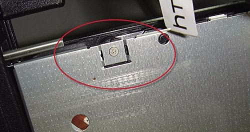 此时放入光盘,假如读盘或写盘还是没有改善的话,那就继续往下看吧。弹出光驱托盘,然后关闭本本。把笔记本翻转过来,打开光盘托盘后面光驱组件的盖板。友情提醒,取下的小螺丝要放好,别掉进本本里,也不要让利器划伤光驱透镜和排线。