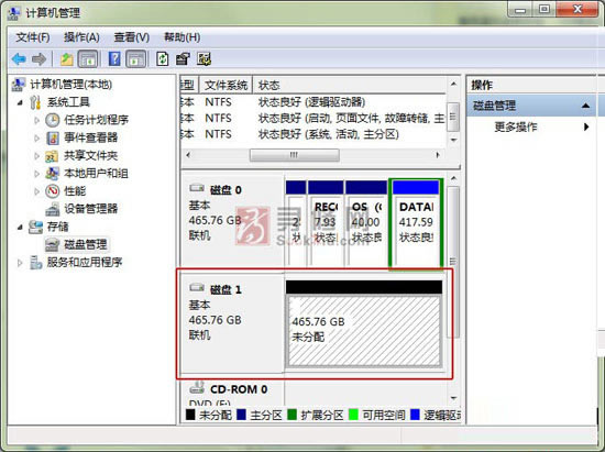 1、将硬盘拆下来,安装到一台正常的电脑上去,开机后在计算机管理里可以看到磁盘1就是那个等待恢复的硬盘了。465.76gb空间未分配,天啊,数据都在里面啊。