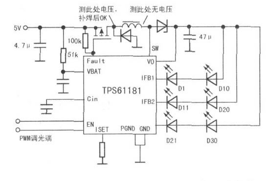 接修一台背光不亮的笔记本,故障为开机后屏上只能看到很淡很淡的开机画面,怀疑背光坏。既然是led则先检查行列驱动,发现背光驱动板有问题,既来找相关资料后把背光的驱动电路画了出来,如图所示,最终补焊了一个电感就修复了。后接修多台led背光的笔记本,都是通过此方法解决,看来这应是led笔记本的通病。
