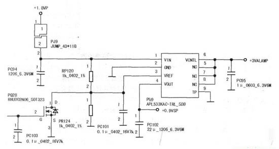 在排除了mos和电容的问题后,就确定是待机芯片max8734的问题,这芯片被动过。于是就换了它,这个时候再测5v和3v的前级不短路,可3v的后级依然短路。于是利用烧机的办法在接点pl6的后级接上最高3v的电压,用手摸,发现pu9微微发热,于是把pu9给焊下,再测3v短路消失了,电路图如下图。