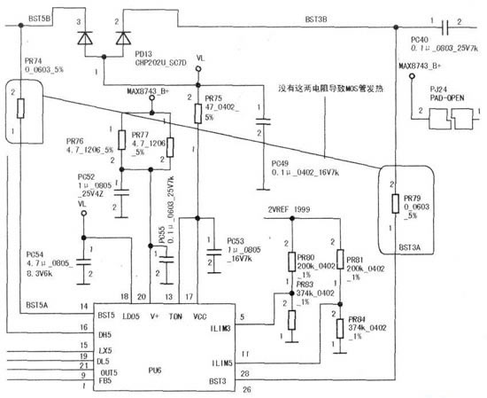 找个一样芯片换上,把所有电路都复原后,再上电测试发现待机电路的mos管pq20、pq30发烫,以为是这两个mos管不稳定,换了两个mos管还是一样,实在是没有办法了,就在想是不是被同行动了手脚。找到图片一对比发现max8734的bst5和bst3线路上的两个0ω电阻pr74、pr79没有了。装上这两只电阻后pq20、pq30不再发热。见下图。