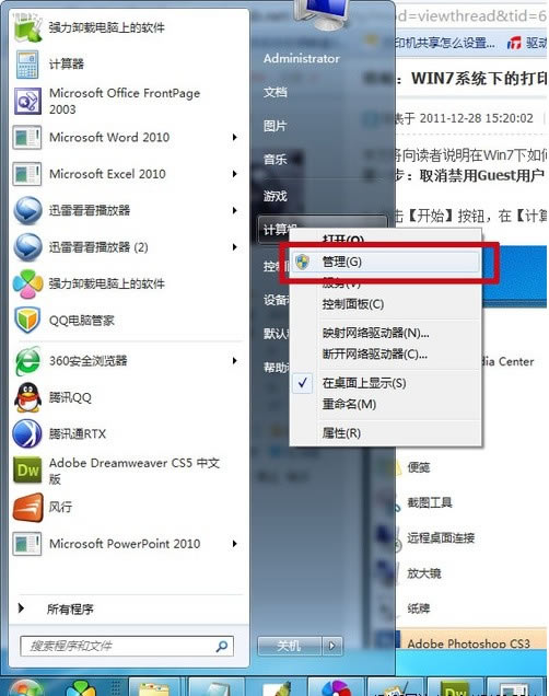 1、点击“开始”按钮,在“计算机”上按右键,选择“管理”,如图一。