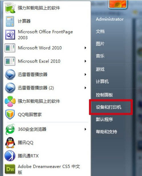 1、点击“开始”按钮,选择“设备和打印机”,如图四。