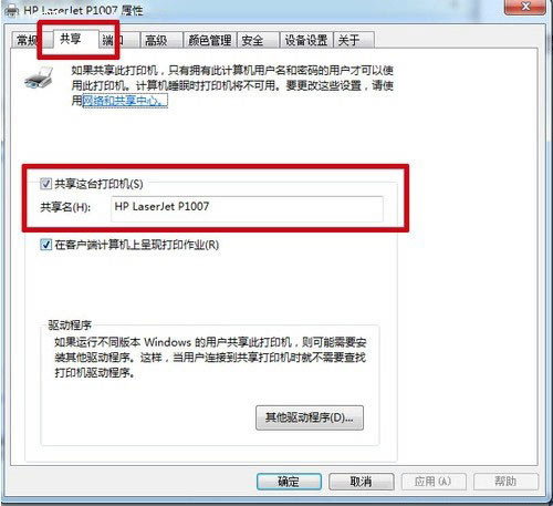 3、打开打印机属性后,选择“共享”选项卡,勾选“共享这台打印机”,并且设置一个共享名,如图六。
