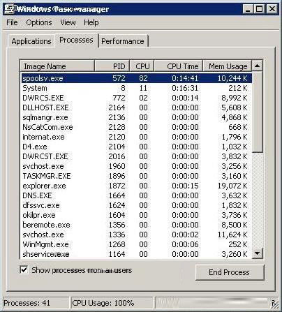 2、按下ctrl+alt+delete键,打开任务管理器,查看spoolsv.exe进程的cpu占用率是否很高。符合以上两点的话,那么 用户的电脑很可能已经受到spoolsv.exe木马的入侵了。