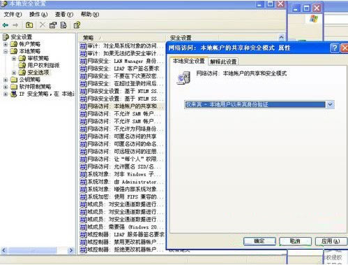 控制面板→管理工具→本地安全策略→本地策略→安全选项里,把“网络访问:本地帐户的共享和安全模 式”设为“仅来宾-本地用户以来宾的身份验证”(可选,此项设置可去除访问时要求输入密码的对话框,也可视情况设为“经典-本地用户以自己的身份验证”)。