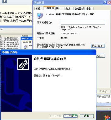 右击“我的电脑”→“属性”→“计算机名”,看该选项卡中有没有出现你的局域网工作组名称,如“workgroup”等。然后单击“网络 id”按钮,开始“网络标识向导”:单击“下一步”,选择“本机是商业网络的一部分,用它连接到其他工作着的计算机”;单击“下一步”,选择“公司使用没有域的网络”;单击“下一步”按钮,然后输入你的局域网的工作组名,如“work”,再次单击“下一步”按钮,最后单击“完成”按钮完成设置。