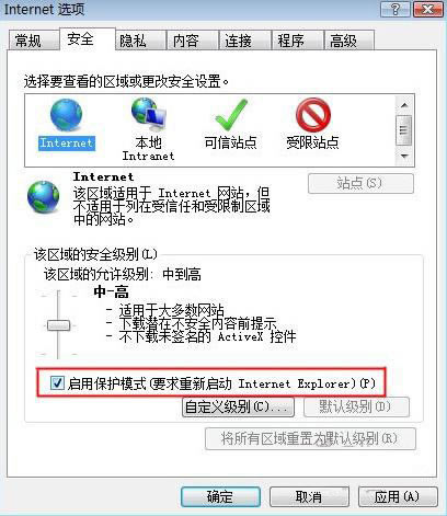 2、打开“安全”选项卡,将“本地连接”和“internet连接”下的“启用保护模式”前的选项去掉。