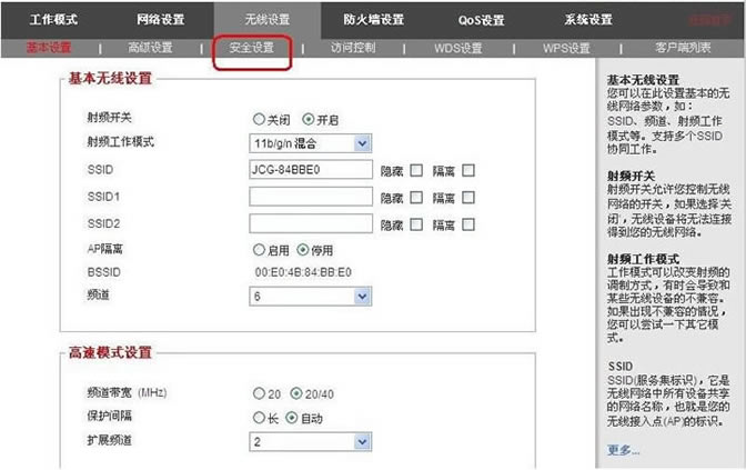 在这里可以修改无线网络名称(即ssid),还有频道。点击“安全设置”,进入安全设置页面,设置无线密码