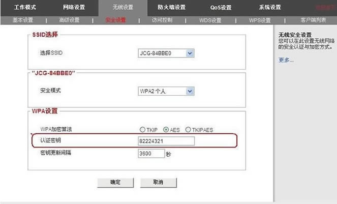 “认证密钥”这里就是无线连接的密码,可以在这里修改密码,如果选用的安全模式是“wpa个人”或“wpa2个人