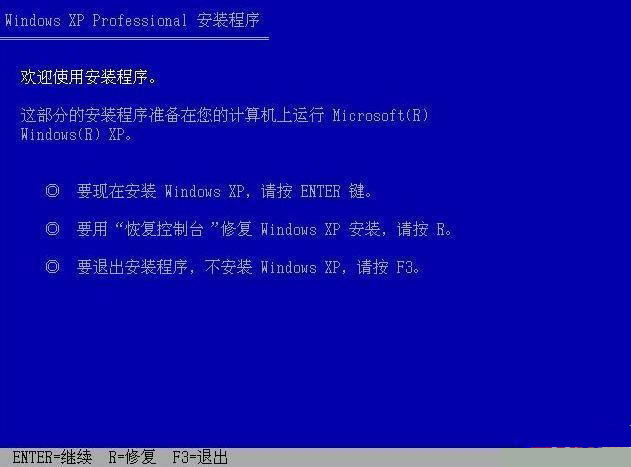 设置bios为光驱启动并从光盘启动winxp安装光盘,出现“欢迎使用安装程序”的界面时按下“r”。