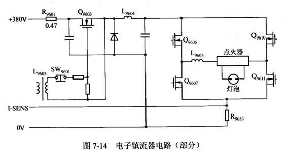 投影机的灯泡都采用电子镇流器驱动。投影机结构紧凑,电子镇流器的体积受到严格限制,由于元件密度较高,散热问题不容忽视。从另一个角度看,电子镇流器是故障高发部件,尤其是桥式驱动器所用的大功率开关管,比较容易出现击穿现象。为了防止熬障范围的扩大,电路中设置有多个保护元件进行保护。图7-14是这种投影机的部分电路,r9601是串接在电子镇流器的电源电路中的保险电阻,在后续电路出现击穿后会因为电流过大而熔断。经测试,该电阻已开路,更换一只相同规格的电阻后,投影机恢复正常。