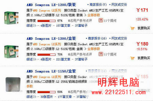 处理器方面,AMD的单核LE-1000系列价格十分便宜,其中LE-1200的主频未2.1GHz,应付日常办公应用已经是绰绰有余,况且180元的价格已经是无敌低了。