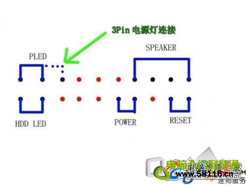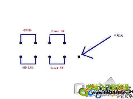 电源指示灯:+/- 可能用名:POWERLED、PLED、PWRLED、SYSLED等