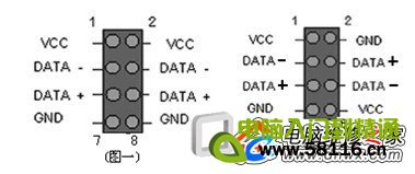 防呆式接口 下面着重说明下,前置USB各个接线的定义。红线:电源正极(接线上的标识为:+5V或VCC)、白线:负电压数据线(标识为:Data-或USBPort-)、绿线:正电压数据线(标识为:Data+或USBPort+)、黑线:接地(标识为:GROUND)。 虽然目前各品牌主板上扩展的USB针脚定义各不相同,但不外乎以下几大类型与接线方法: 第一类:8针型 该类型的针脚是1999年以前生产的主板所用,不过目前少数P4级(低档)主板也有采用这种类型的针脚。通常接线方法:将红线插入USB针脚1与针脚2,余下接线按Data-、Data+、GROUND顺序分别插入余下USB针脚(见图一),第二种接线方式是与第一组接线正好相反(见图二。