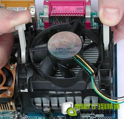 图2 第四步,在CPU的核心上均匀涂上足够的散热膏(硅脂)。但要注意不要涂得太多,只要均匀的涂上薄薄一层即可。 提示:一定要在CPU上涂散热膏或加块散热垫。这有助于将废热由处理器传导至散热装置上。没有在处理器上使用导热介质会导致当机甚至烧毁CPU!此外,无论散热装置的接触面有任何细微的偏差,甚或只是一小点的灰尘,都会导致无法有效的将废热从处理器传导出来。散热膏同时在CPU的接触面上(就是印模)也充满了极微小的散热孔道。一些散热装置的制造商会在其产品中附有散热膏,如果你的没有,在大多数计算机或电子零件商店都会有卖,价格大约5元。 CPU的安装一般很简单,但CPU风扇的安装较复杂,其步履如后: 第一步,首先在主板上找到CPU和它的支撑机构的位置,然后安装好CPU。 第二步,接着将散热片妥善定位在支撑机构上。 第三步,再将散热风扇安装在散热片的顶部——向下压风扇直到它的四个卡子鍥入支撑机构对应的孔中; 第四步,再将两个压杆压下以固定风扇,需要注意的是每个压杆都只能沿一个方向压下。(见图3)