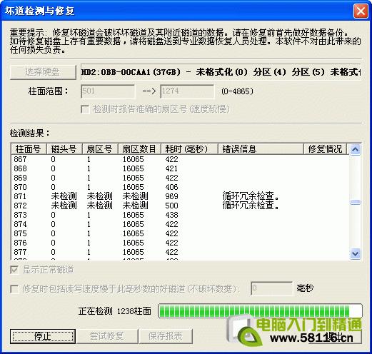 检测过程中遇到坏道时,检测速度会变慢。检测完毕,软件报告检测到的坏道数目。