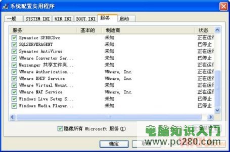 ![]() 图1 第二步:除了“启动”项加载的程序外,一些程序也会自身为系统的服务。同样将不需要的服务取消即可,还是在“系统配置实用程序”中,切换到“服务”标签,为了防止将一些系统服务禁用后造成系统的不正常,可以将“隐藏所有Microsoft服务”选项勾选,然后再根据服务的名称判断,去除不需要的服务(见图2)。