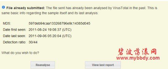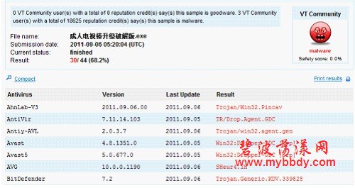 尽管QQ群蠕虫自动传播扩散的能力极强,但是由于国内外主流杀毒软件均可轻松识别查杀该蠕虫病毒,因此目前并未形成严重危害。Virustotal扫描结果证明,44款杀毒引擎中,有多达30款能够检测出QQ群蠕虫,可以保证在蠕虫运行前就将其清除。
